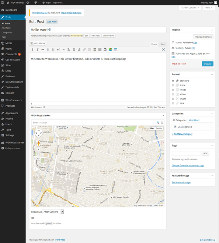WEN Map Marker is very helpful plugin to display Google Map in your site simply typing your address which any knowledge of the coding. Post type can be selected from setting and latitude & longitude can be set for each post. We have also added button in editor which enable to add map shortcode in post. You can also generate shortcode for map regardless to the post, which can be used in your post, page or sidebars. Custom zoom level can be set for each map. This plugin is very much useful for your pages like contact page, etc where you can show location of your organization in map.