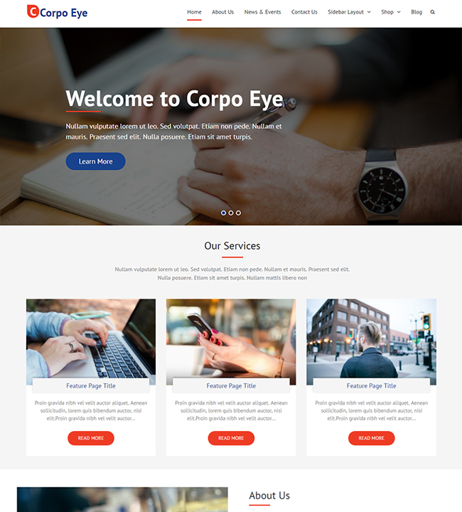 Corpo Eye  is a modern and robust, versatile and flexible, powerful and easy to use, technologically competent and very responsive WordPress multipurpose theme. It is a reliable platform for creating impressive websites for a range of purposes. Personal, corporate, professional and business users alike find this theme an ideal solution. In a matter of minutes, it can set you up with sophisticated custom websites. Regardless of your previous development or coding experience, it delivers sharp, polished results. It comes packed with many useful features, and a design that never fails to impress. Official Support Forum: http://themepalace.com/support-forum/ Full Demo: http://wenthemes.com/theme-demos/?demo=corpo-eye