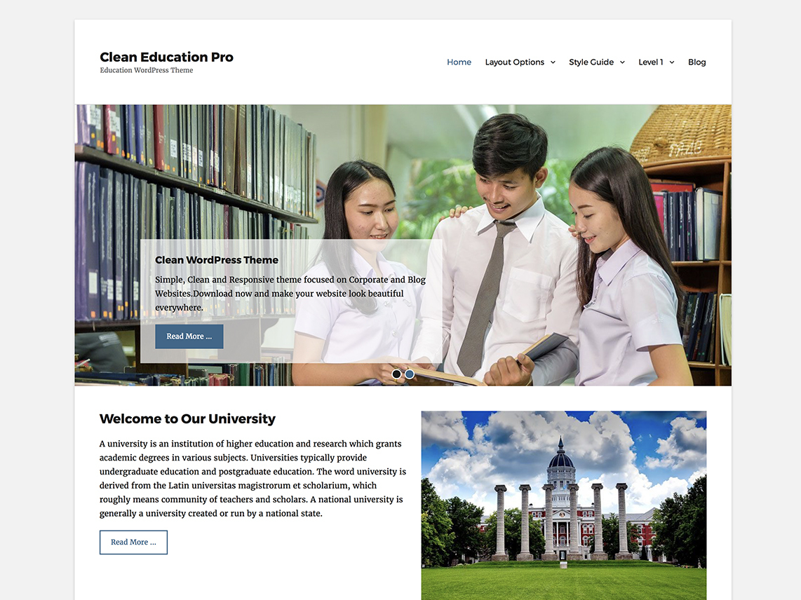 There are sections for courses, professors, recent news, events, and testimonials. Display your most impressive facilities and content on the forefront with the Featured and Hero Content sections. Clean Education Pro also comes with Advanced Color Options, WooCommerce, and WPML support. Also, Clean Education Pro is translation–ready.
