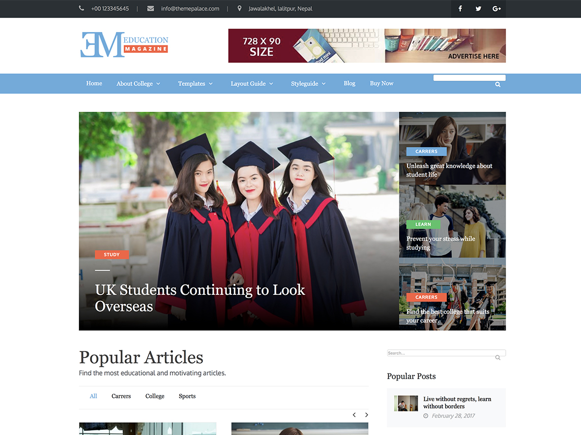 EduMag Pro theme is a modern magazine styled Premium education WordPress theme. It is easily customizable and has been built using theme options based on customizer API with live preview. It is the recommended theme for numerous educational professional and magazine websites. Educational academies, for instance, universities, colleges, schools, and specialized learning centers can benefit from the theme. It is flexible enough to use it for general purposes also.