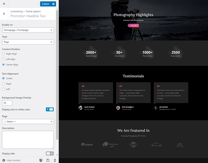 In Signify Pro, you will find sections like Header Media Customization, Custom Menus, Comment Options, Contact Section, Featured Content, Slider Options, Gallery, Header Top, Hero Content, Site Layout, and many more. In addition, Signify Pro also comes with advanced color options and font family options to better enhance your site.